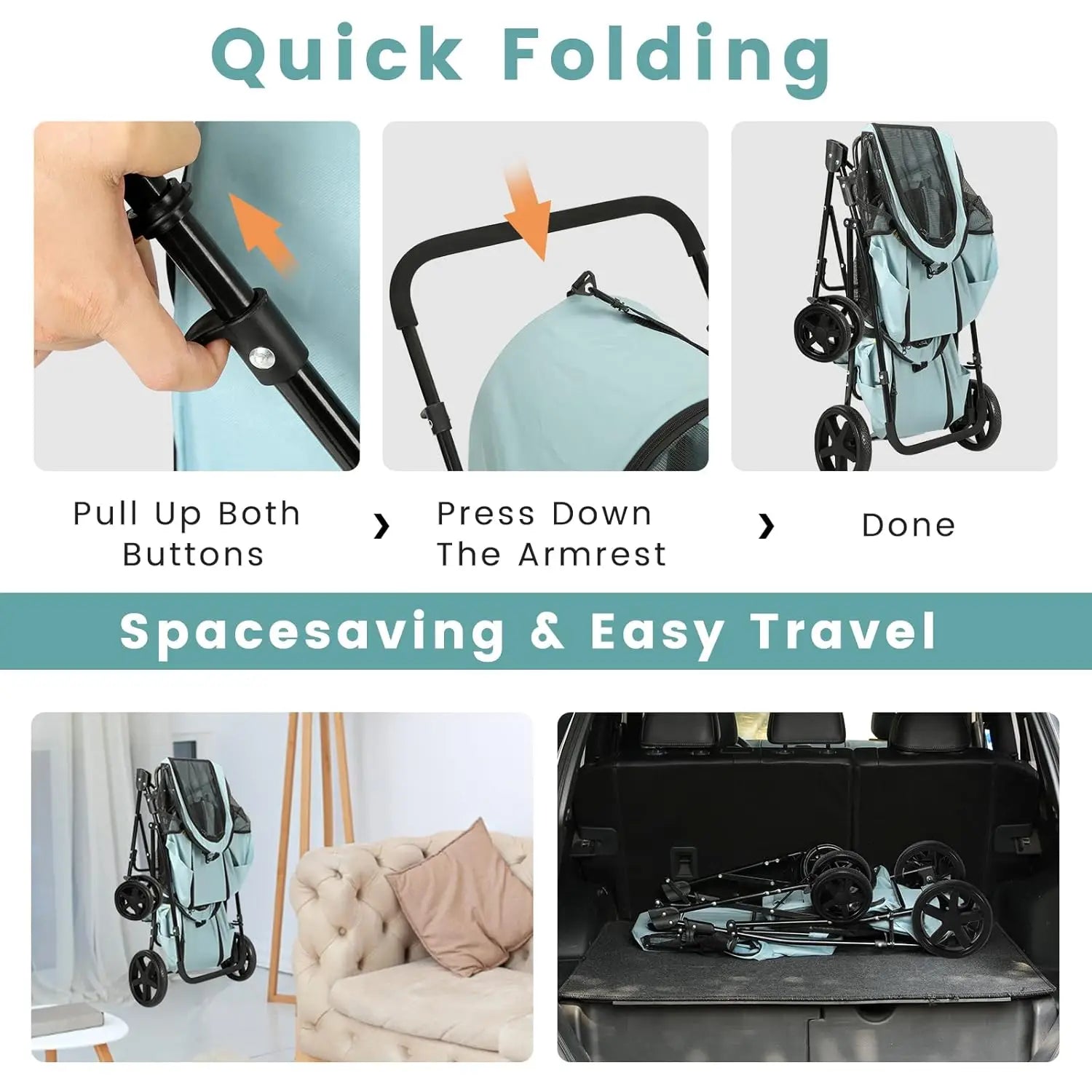 - 【QUICKLY SET UP & FOLDING】The dog stroller easy to setup in few minutes with the install manual and no tools required; When you done, fold the stroller easily with a press of a button on the handle; The folded cat stroller size is 32.5"H x 20"W x 14"L and weighs only 17lbs, you can put the cat stroller into the trunk of the car; Great for travel and camping & create minimal space for storage.