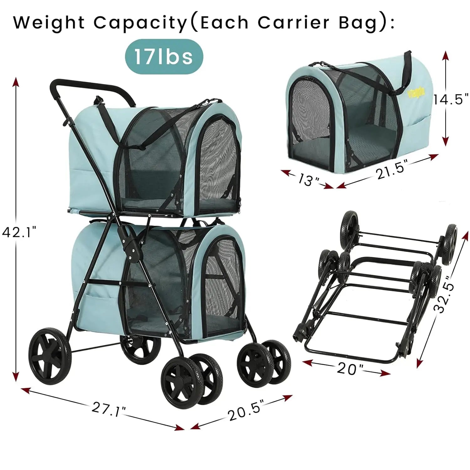 - 【4-IN-1 USE 】All in One: this foldable pet stroller can be used as Double Pet Stroller or Pet Travel Carriers or Pet Booster Car Seat. You can decide how to use it according to your different ways of going out. Each pet carrier size is 14.5"Hx 13"W x 21.5L".